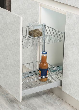 Выдвижные корзины устанавливаются в кухонный шкаф. Как правило, имеют два или три уровня. Оптимизируют пространство на кухне и позволяют удобно хранить банки, бутылки и кухонную утварь.